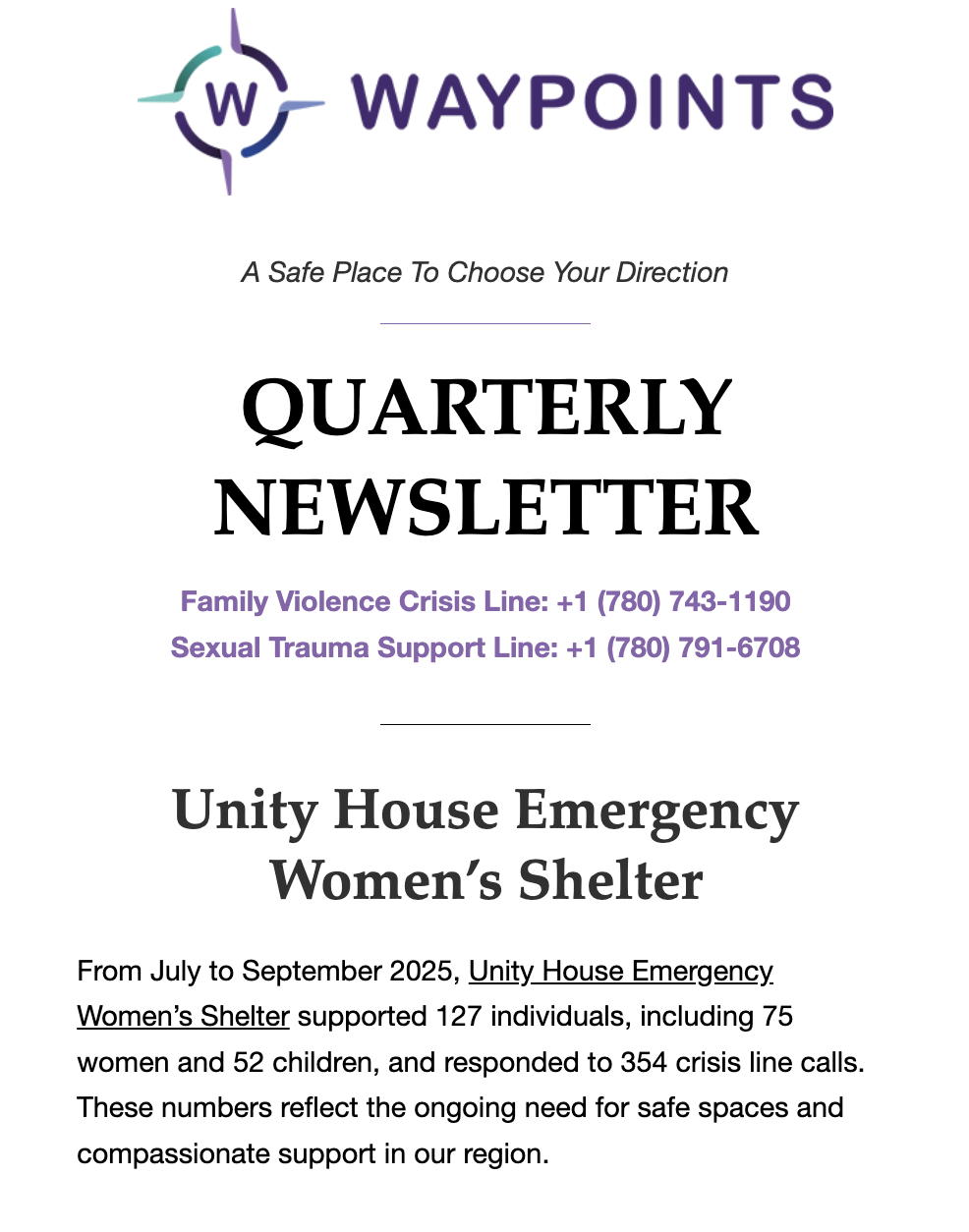 Stay connected with Waypoints through our newsletter, sharing updates, program highlights, and community initiatives that support survivors of domestic, family, and sexual violence.